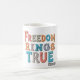 T-shirt-designen innehåller frasen "Freedom Ringar True" i ett dynamiskt, flerfärgat teckensnitt. Färg är djärvt och öga-och skapar en dynamisk och energisk känsla. Utformningen är modern och minimalistisk, med texten centrerad på skjortan. Den övergripande estetien är upplyftande och inspirerande och firar frihetskonceptet.
