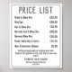 Prislista Affisch för en frisör, frisör eller frisersalong. Frisör affisch, frisör affisch eller frisersalong affisch. Ändra priser som du önskar. Visar upp till 7 artiklar och priser plus kontaktinformation. Svart och vit.