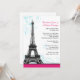 Inbjudningar: Eleganta och moderna parisiska bröllopsinbjudningar för endast mottagning med ett gråskaleformat Eiffeltorn ovanpå en fuchsia rosa botten med akvatiska blå utsmyckningar bakom.