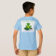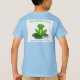 Adorable and cozy frog themed, soft, light blue t-shirt with cute lily pad logo on the back. Customizable with the name of child in the front.