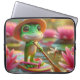 Cute whimsical grönt groda som paddlar en flip-flop i en damm med rosa vattenlilies