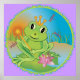 Grönt grodprins med krona och trollspö är så lycklig som möjligt på hans lilypad omgiven av drakflugor. Designad i ljusa färger för barn eller baby.