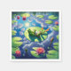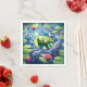 En levande groda med grönt sprejas bekvämt på en lilja, och blöder i sol i en vattnig damm som är prickad med blommor från rosa.