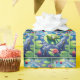 En levande groda med grönt sprejas bekvämt på en lilja, och blöder i sol i en vattnig damm som är prickad med blommor från rosa.