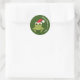 Roligt julklistermärken som visar en leende groda i en julhatt på gröntens bakgrund. Dessa söta klistermärken har ord "God jul" och ett anpassade år. Frog Santa God jul Classic Round Sticker Holiday Design | ©Melissa Patton - Artist/Illustrator