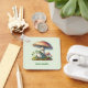 A keychain with a cool illustration. Featuring a green frog sitting on a mound of grass. A big red mushroom sheltering him from the elements. A couple of little toadstools nearby.