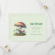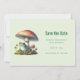 Save the date card with a cool illustration. Featuring a green frog sitting on a mound of grass. A big red mushroom sheltering him fron the elements. A couple of little toadstools nearby.
