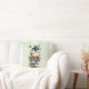 A pillow with a cute St. Patrick's Day image. A green frog with big cartoon eyes sitting on a stone wall. Wearing a green top hat with a shamrock and a little friend sitting on top of his hat.
