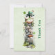 Thank you card with a cute St. Patrick's Day image. A green frog with big cartoon eyes sitting on a stone wall. Wearing a green top hat with a shamrock and a little friend sitting on top of his hat.