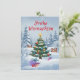 Weinachtskarte mit einer festlich geschmückten Tanne im verschneiten Wald. Um den Baum versammeln sich niedliche Tiere, die von Geschenken und Lichterglanz umgeben sind. Das liebevolle, märchenhafte Design eignet sich perfekt für Kinder und Erwachsene gleichermaßen.