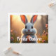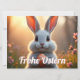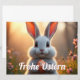 Ein niedliches, weiß-graues Kaninchen sitzt inulleiner blühenden Frühlingslandschaft. Es hält ein orangefarbenes Osterei mit Blumenmuster in seinen Pfoten und t mit großen, leuchtenden Augen in die Kamera. Die warme Abendsonne taucht die Szene in ein goldenes Licht, während im Vordergrund zarte rosa Blumen blühen. Schriftzug "Frohe Ostern" verleiht dem Bild eine festliche Osteratmossphäre.