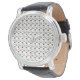 Front and back view of a wristwatch with a colorful patterned dial and black leather strap. The watch has a silver casing and a smooth, sleek design.