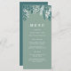 Denna middagsmeny har en illustration av snöig lövverk i en grön och vit färgpalett med bär, eukalyptus, granbarr och blad. Detta skulle vara perfekt för en elegant festlig tillställning eller för en middagsmeny på en vinterbröllop.