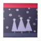 En söt som har tre blå blekblå Julgranar på en blå bakgrund. Snöflingor faller försiktigt ned. En röd helgdag högst upp.