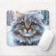 En fluffy Maine Coon-katt med stort ögon och ansikte täckt med fruset snö mot en bakgrund av hög, snö-lastad gräs träd