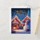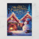 Festlig julkort med en glad snöman som står framför ett mysigt hus i ett vinterlandskap.