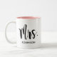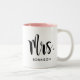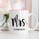 Enkel och modern kaffekopp med fru i script med efternamn anpassad text. Perfekt present för ett nygift par! Besök vår butik för den matchande Herr Monogram-mugg.