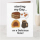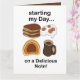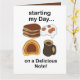 Frukost Startar Min Dag På En Läcker Not Kort ursprungligen designat av Nisha Prabhu. Ett "Frukost Startar Min Dag På En Läcker Not" -kort är ett charmerande och förtjusande gratulationskort perfekt för att dela morgonens glädje. Den har en livfull design med illustrationer av frukostglädje - fluffiga pannkakor, soliga ägg och ångande kaffekoppar - arrangerade i ett tilltalande mönster. Framsidan av kortet visar elegant, lekfull typografi med frasen "Startar Min Dag På En Läcker Not", kompletterad med dekorativa detaljer eller glada accenter. Inuti finns det gott om utrymme för ett personligt meddelande för att önskar någon en välsmakande, glädjefull morgon. Detta kort är idealiskt för att inspirera till