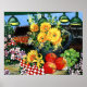 En färglös målning av frukt och blommor på dagstugan bord på Ställe-marknaden i Seattle.
