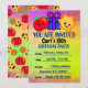 Bara några underbara glada frukter för att göra födelsedagsinbjudningar med massor av solsken och regnbågar. Vänligen använd den blå "personalisera"-knappen för att ändra texten och anpassa ytterligare för att justera storlekar. Vi hoppas att din valda fest kommer att vara med massor av kärlek, skratt och godis! Designen visar en busig äpple, en gnistrande ananas, en strålande sol och massor av gullighet. Ha en bra dag och underbart festligt kul. Annars, skvallra, vet du vad som är den mest hjälpsamma drycken på fester? Citron-aid!!! :-) hu hu hu!