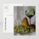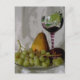 en söt livsmålning av ett glas vin, en massa druvor och ett gyllene päron på en genomskinlig platta.