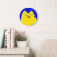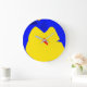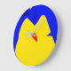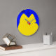 Den här blå bakgrundsmuren har en illustration i form av ett päron med gult och ett trekantigt rött centrum.