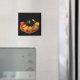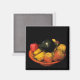 Den här slående magneten har en lustig skål som flödar över med frukt. Ett äpple, en avokado, päron och bananer i en skål med orange mot svart bakgrund skapar en underbar, konstnärlig sammansättning.