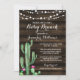 En lantlig perfekt för inbjudan för dusch för kaktusbebisfrunch för ett themed party för öken. Denna moderna design presenterar vattenfärgkaktusillustrationer, stränger ljus och en mörk wood bakgrund.