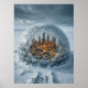 En fantastisk futuristisk stad innesluten i en massiv glaskupol, omgiven av ett isigt, öde landskap. Varma gyllene ljus kontrasterar vackert mot den kalla snön och skapar en kraftfull visuell bild av överlevnad, innovation och isolering. Perfekt för moderna interiörer, science fiction-fans och konst för statementväggar. Lämplig för canvas, posters och metalltryck.