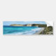 Bild är en lång vy över akvblått havsvatten vatten som bryter sig på vit sand med höga klippor och spolvegetation