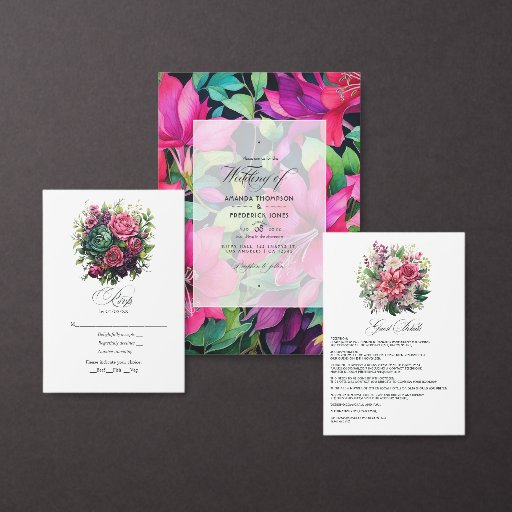 Fuchsia, Emerald Grönt och Black Blommigt Bröllop Inbjudningar