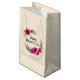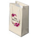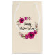 En presentpåse designad med söt fuchsia rosa poppies och dekorativa sprickor och löv i en cirkulär blommigt-andedräkt. Lycklig Mors dag är skrivet i ett sött trendig. Söt och elegant. En digitalbild som skapades med vattenfärgsfärg.