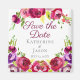 Vackra ljusa vattenfärgblommor i rosa dekorerar detta romantiska, moderna Spara datum magneter för en sommareftermiddagsceremoni i en trädgård. Den vackra kursiva skriften är framtagen av en fantastisk magenta och lila blommigt buquet på söt magneter.