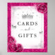 Lägg till en gnutta saga magi i firande med den här eleganten Kort- och presentbordsskylten, med originalfärgbilder av Raphaela Wilson. Designad i en pulserande fuchsia- och silver färg-palett, denna 8x10 nedladdningsbara skylt visar fuchsia ro, sprider fjärilskonetti och en regal prinsessa krona / tiara. Det är perfekt för en magenta quinceanera/söt 16 födelsedagsfest, shock rosa. gång på en möhippa, en flickdusch och annat magiskt firande. Hämta, skriv ut och visning omedelbart för att vägleda gästerna till din gåva till bord i att förmana stil. Kategori: Bords-skyltar i shock rosa, 8 x 10 bord-toppskyltar och nedladdningsbara kort och presentkort med fjärilar. Fuchsia quince temaparty färg: mörk magenta, shock rosa, stark rosa för lila, mörk grått, lätt grått, faux metallic silver, svart och vitt.