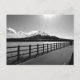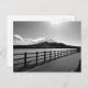 Ett svart och vitt fotovykort från Fujis socklade montering i snö från Sjö Yamanaka, en av Fuji Fem Sjöar.