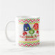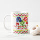 Ditt party för den festliga och roliga fula jul- eller helgdagtröjan ska är alla färdigare med denna skräddarsy keramiska mugg som en pris för vinnaren av den fula tröjatävlingen. De två tacky tröjorna hoppar av det rött, vit, och görad randig mönsterbakgrund för grönt parar sparren med en hängande grön prydnad, två av mittens, en snögubbe, candy cane, strumpa och Santa huvud. Tillfoga precis året i texten boxas förutsatt att eller personifierar den hur du önskar. Om du behöver någon hjälp som skräddarsy denna humoristiska mugg för ditt party, e-posten niteowlstudio@gmail.com.