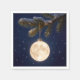 En strålande julprydnad i måne är på ett skoningslöst sätt upphängd från ett snö-dammigt gren, omgivet av ett twinkling av stjärnor på natten himmel
