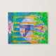 Ett söt pussel med en fridfull kvinna i ett träd pottoga-läge med en ljus lotus-blomma i rosa i en damm, träd och stor lila i måne som målats med vattenfärg. En underbar gåva till en yogainstruktör eller någon som har yoga!