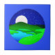Keramiskt plattor i cirkulär illustration av ett fullt måne som stigning över grönt backe vid en sjö-strand, med en stjärna vid midnatt blå himmel