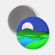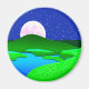 Ett cirkeldiagram över ett fullt måne som stigning över grönt backe vid sjö, med en stjärntur vid midnatt blå himmel