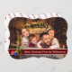 En modern fotojulkortsdesign med din familj som fyller kortet ansikte. Roligt-elf-dekor med mörk-rött textband för ord.