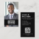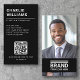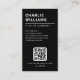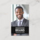 Svart eller valfritt färg, lodrät affärskort med dig logotyp och foto på framsidan och namn, QR-kod, namn, rubrik och kontaktinformation på baksidan.