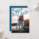 Fullt sparar datumet med skripttextdesign på framsidan och tre foton på baksidan av kortet. Färg på baksidan och texten kan ändras när du anpassar för att komplettera dina egna förlovningar.