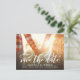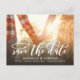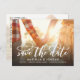Spara datum meddelande-vykortet i snyggt visar ditt foto genom att para det med ett typiskt och romantiskt modernt kalligrafiskript som lyder "Spara datumet". Baksidan har ett extra foto med vit genomskinlighet över den. Lägg bara till foton och information om din stora dag med hjälp av den mall som finns.