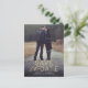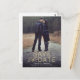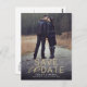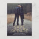 Den här eleganta minimalisten sparar datumet med enkel typografi och visar ett stort foto av det förlovade paret. På framsidan av vykortet visas ett foto med en guld-textövertäckning som lyder "Spara datumet" tillsammans med parets placering i namn, bröllop och bröllop. Lägg till ytterligare uppgifter om bröllop (t.ex. bröllop webbplats) längst bak på vykortet.
