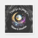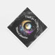 Ett underbart och dynamiskt 3D-tittar i måne flyter över ljusblå fluffiga moln som har små stjärnor som roterar i dem. Måne är inramat av ett faux guld, magenta och blå halvmånsstjärnor måne som har små tvillingstjärnor i det och en skarpare svart teaterraktraps. Redigerbara vita mallar visas under bilden. Perfekt för ett måne och stjärnor bröllop; för din speciella stjärnnattsårsdag eller för vilket wiccan-företag som helst; invigning eller semester.