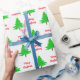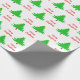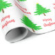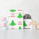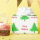 A fun, festive design of simple green Christmas trees covered in colorful ornaments with a yellow star on top surrounded by the words “Merry Christmas”.