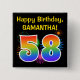 This fun, vibrant button design features a colorful pattern inspired by bursting celebratory fireworks, along with the number "58" having a multicolored rainbow like spectrum or gradient pattern. It also features a customizable name and event message, such as a "Happy Birthday" birthday greeting. A button like this might be worn by the attendees at a birthday party being held to celebrate somebody’s fifty eighth birthday. [~Z0000334]
