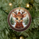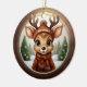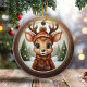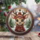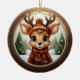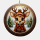 Fun Whimsical Winter Wildlife Christmas Deer with Antlers. Xmas Reindeer Personalizable Rustic Wooden Frame Decoration. Custom Holiday tree ceramic ornament. Cute baby woodland animal in a cartoon graphic style, wearing a coat, hat with customizable text and scarf. In the background, a wintry snow wonderland scene, completes the season's charm of this unique doe decor. The two sided fawn illustration ensures that no matter how the hanging design turns, it always looks festive and complete. 🩌🎄 Dimensions: Diameter: 2.87". Thickness: 0.156". Weight: 1.4 oz. Made of white porcelain. Full-color, full-bleed printing. Included gold thread does not come attached/tied.