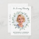 Modern vattenfärg Eucalyptus Greenery Sympathy Photo Funeral Tack du Cards. Dessa sympatigravkort har en unik fotomall i botaniskt andetag i eukalyptus, namn och data, på en modern vit design. Anpassa dig med ditt tack. Dessa minneskort är perfekter för begravning av tackkort eller firande av livets tackkort. COPYRIGHT © 2020 Judy Burrows, Black Hund Art - Med alla Höger reserverade. Minnestacka för ditt kort för att du känner igen Bild